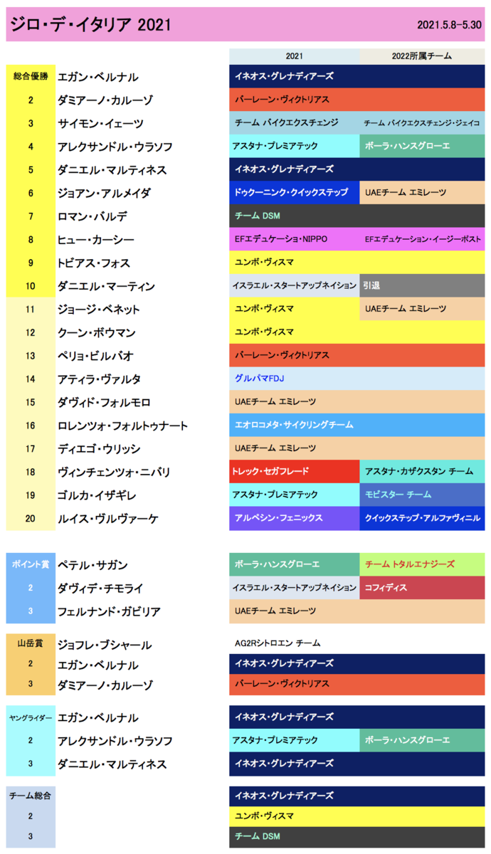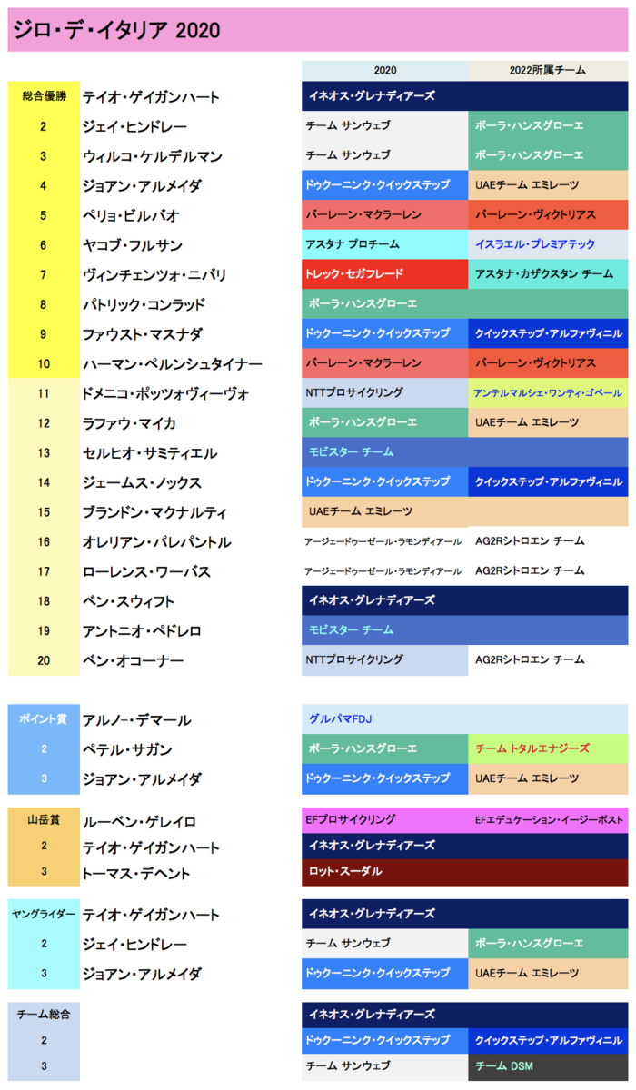 過去3年でトップ10に複数回入っている選手は、サイモン・イエーツ、アルメイダ、ニバリが2回。チーム別では、イネオス、バーレーンが4人、クイックステップ、アスタナ、DSM(サンウェブ)が3人づつ。グランツールに強いユンボとUAEはジロには注力していなかったのがわかる。
