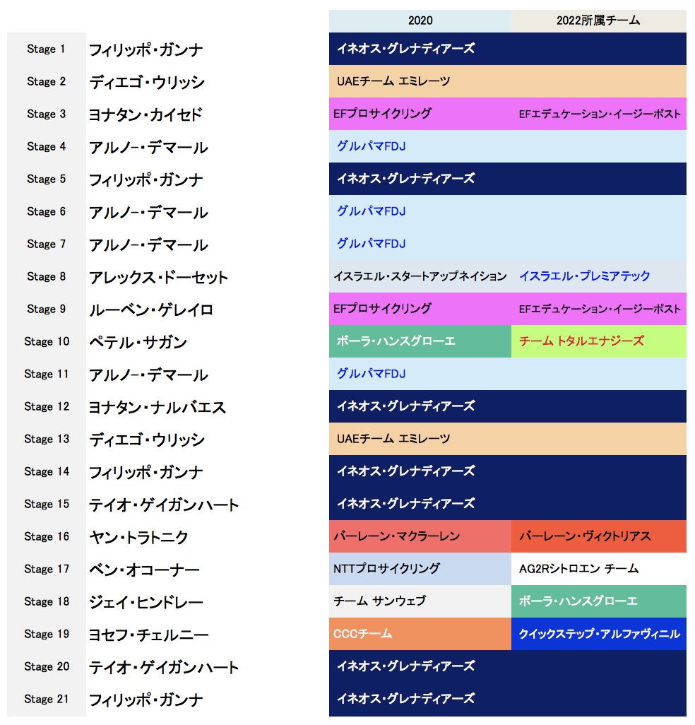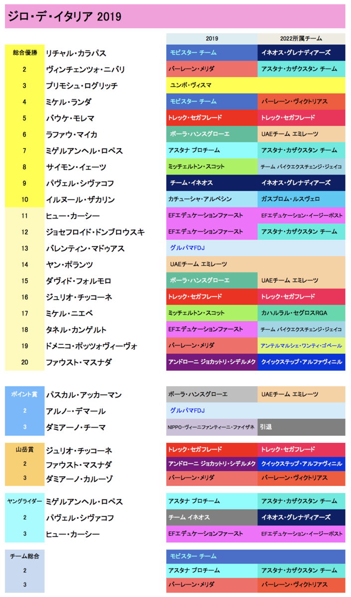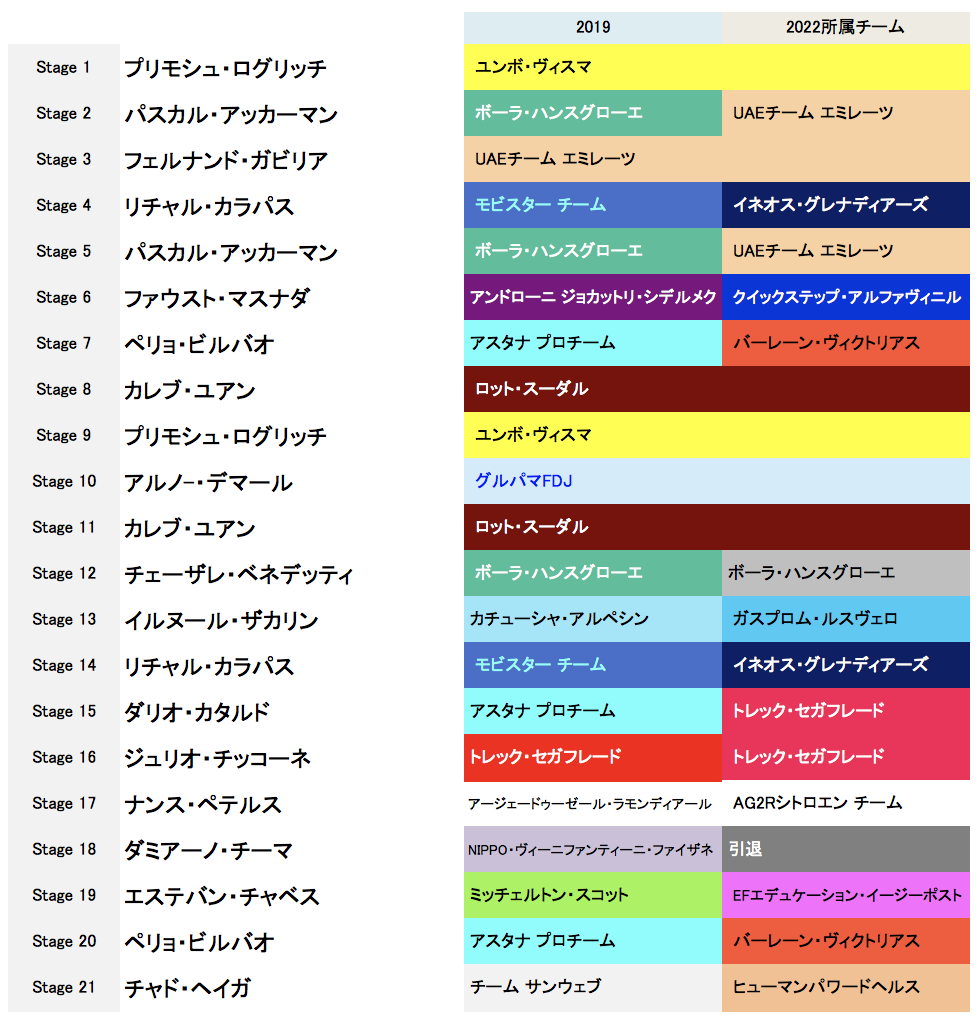 参考までに過去3年間の総合成績20位までと各賞(ヤングライダー・ポイント賞・山岳賞)、各ステージ優勝者を記載しておく。所属チームは今季との比較も(ちょっと見づらいと思うがご容赦を)。