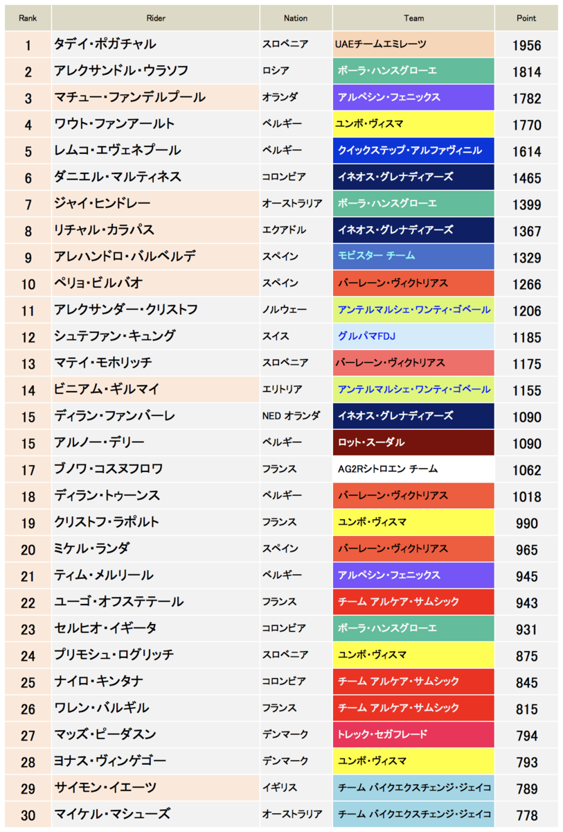 グランツールシーズンがはじまった。ジロの成績が大きくポイントに影響したので、チームも個人もランキングが大きく入れ替わった。入れ替わった選手を見るとジロで活躍した選手たちがよくわかる。現時点での成績をチェックしてみた。