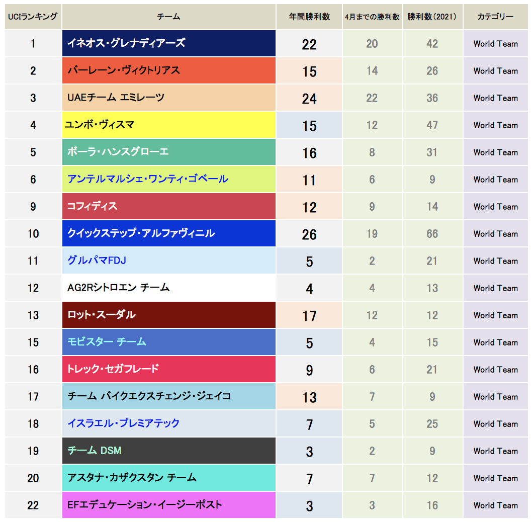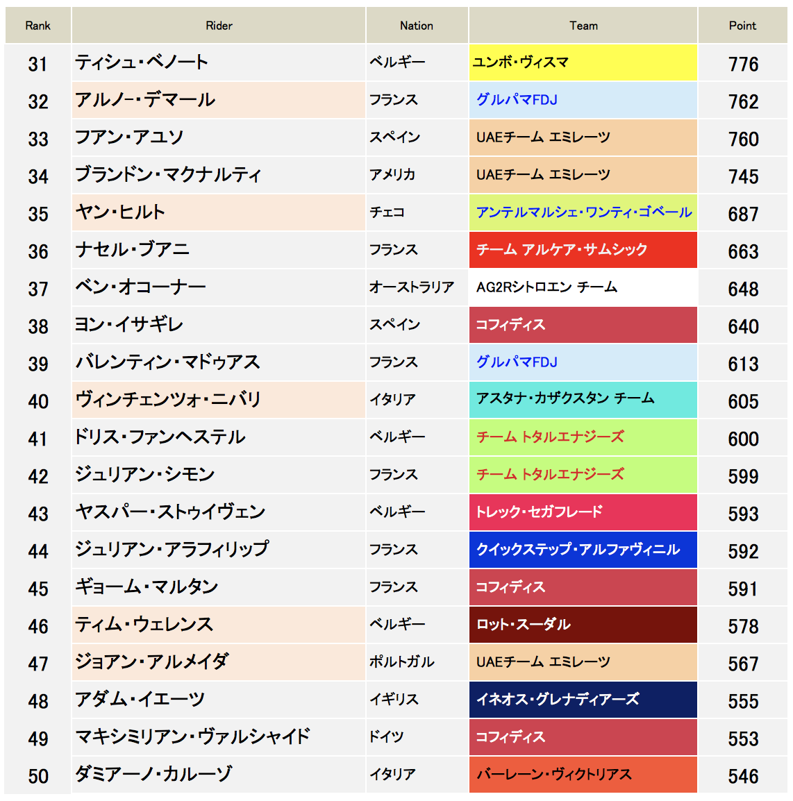 *今月からチーム順をUCIポイントの獲得順にしています。