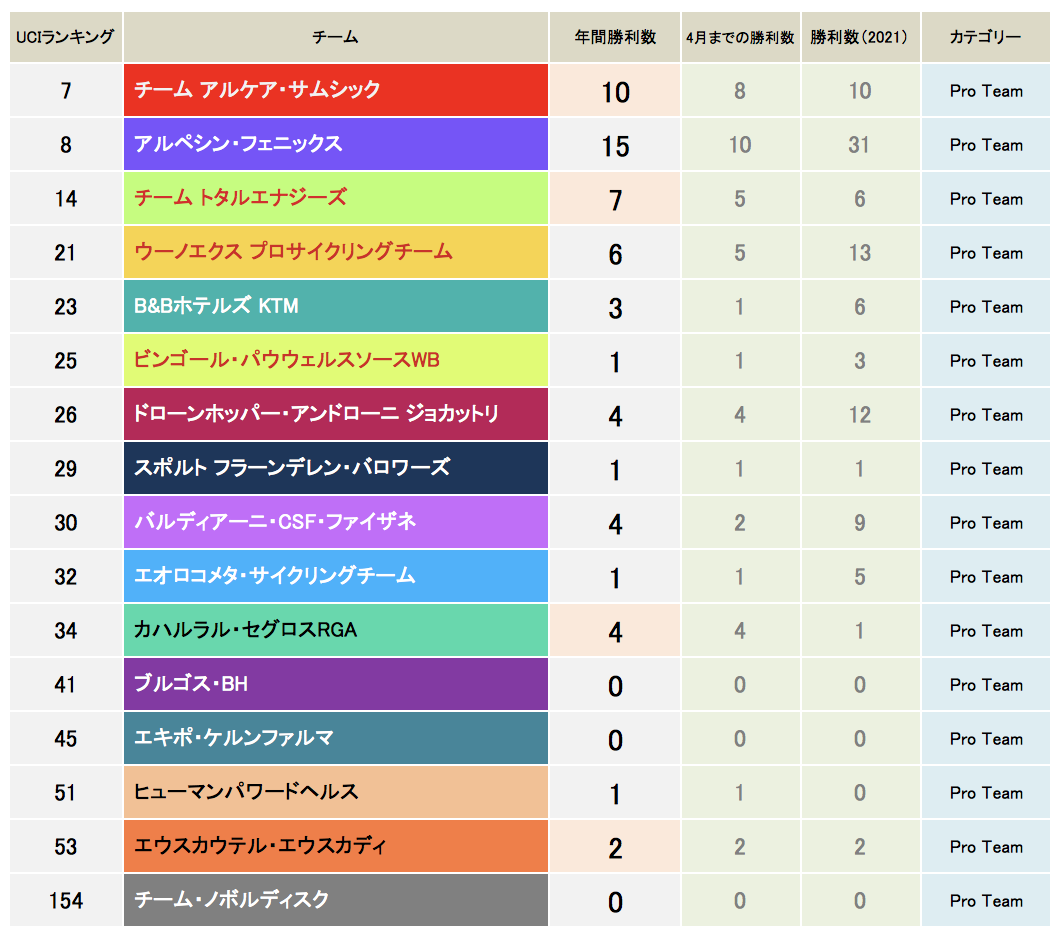 プロチームでは、アルケアがランク7位と相変わらず好調をキープしている。ジロに出場しなかったものの他のレースで2勝し、年間勝利数は昨年と同じ数になった。アルペシンはジロで3勝し、さらに加速してきた。先日、スポンサー変更に伴い、来季からのチーム名を「アルペシン・ドゥクーニンク」にすることが発表され、いよいよワールドチームカテゴリーへの参戦を表明した。さらに勢いがついてきそうな様子がうかがえる。トタルエナジーズ、ウーノエックス、アンドローニもまずまずの成績。