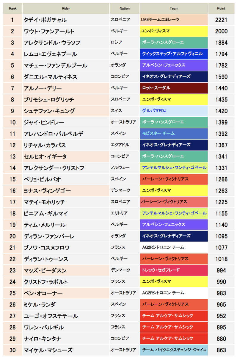 今年の半分以上のレースを終え、シーズンは後半を迎える。好成績を残しそうな選手とチームがはっきりしてきた。6月終了時であり、前半終了時の成績まとめでもある。6月に大きくポイントを伸ばしたのは、ツールの前哨戦で活躍した選手が中心。ツールに出場する選手も多いので、トラブルがなければその選手は7月もツールで大きくポイントを稼ぐ可能性が高い。それによってチームのランキングも当然ながら変化する。他には各国ナショナル選手権で活躍した選手がいるチームもポイントを稼いだ。前月から大きく順位を上げた選手を中心に軽くチェックしていく。