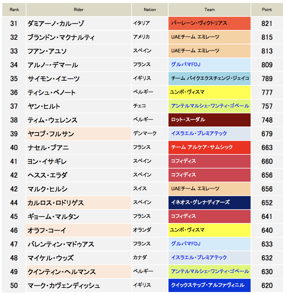 現時点のランキング上位50名を表にした。およそ半分のレースを消化し、7割くらいの選手は年間でもトップ50に入れると思われる。参考までに昨年のランキングでは1000ポイント以上稼いだ選手はトップ50に入っている(51位が1014ポイントのデマールだった)。