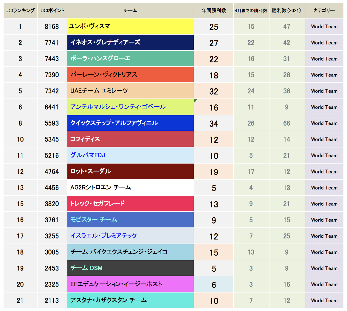 *先月からチーム順をUCIポイントの獲得順にしています。