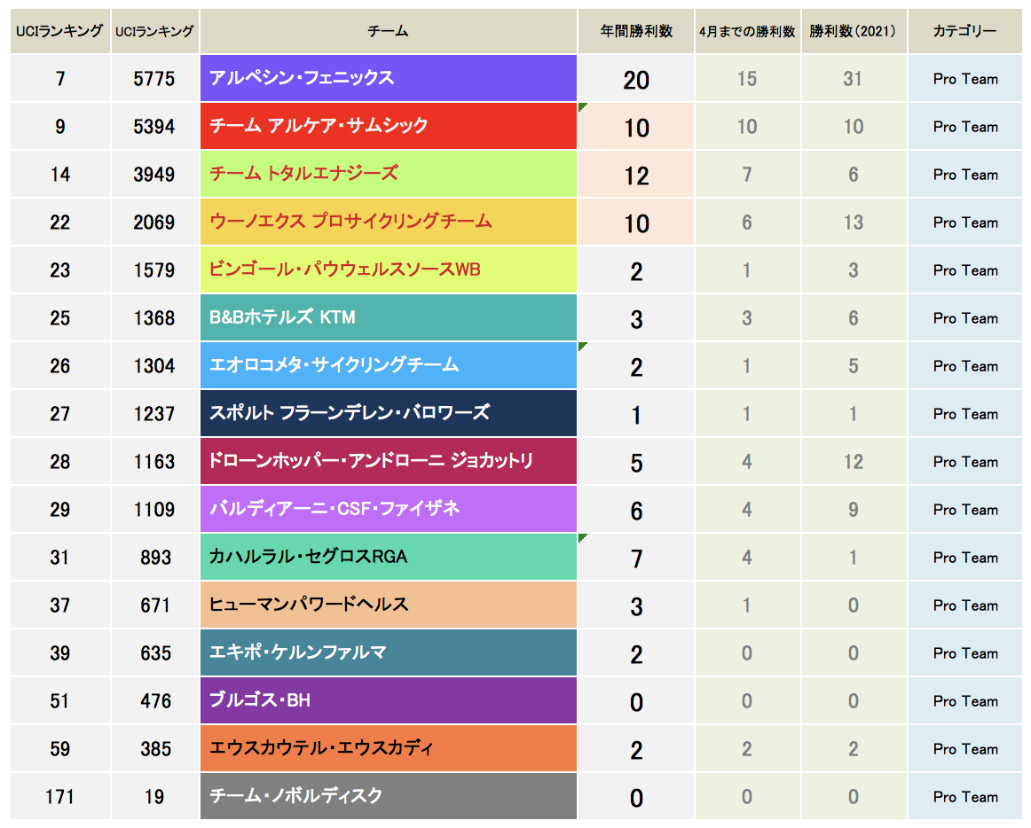 プロチームでは、アルペシンは5勝し、アルケアを抜いてプロチームではランク7位と最上位になった。ツールからはチーム名を「アルペシン・ドゥクーニンク」に変更し、さらに勢いがつきそうである。一方アルケアは少し足踏み状態。前半だけですでに昨年一年を上回るポイントを稼いでいるが、来季ワールドチームに昇格が確実視されている中では、少しでも多くのポイントを稼いでおきたい。トタルエナジーズは5勝し、サガンもようやく復活傾向。これから大暴れしてくれることを期待する。ウーノエックスも4勝して好成績、昨年の13勝を大きく上回り過去最高の成績をあげそうな勢い。