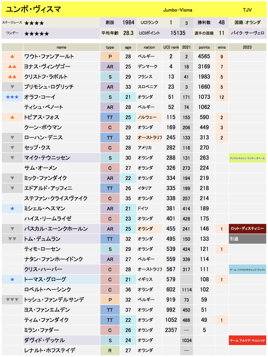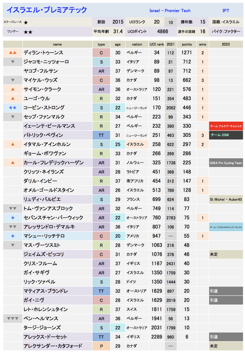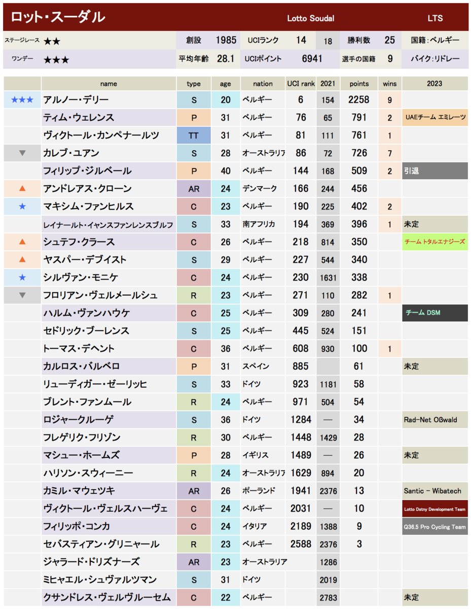 *選手は今年獲得したUCIポイントによるランク順で全選手を記載。名前がグレーになっている選手は来季チームを離れる。*脚質タイプは限定しにくい選手もいるので、あくまで目安です(脚質は、AR=オールラウンダー/C=クライマー/P=パンチャー/S=スプリンター/R=ルーラー/TT=TTスペシャリストで分類。主にチクリッシモを参考にしています)。*年齢は2022年12月1日現在で、背景色が水色なのはヤングライダー資格者。*国名に色がついているのはその国のナショナルチャンピオン。*UCIランクは2022年と2021年を記載。*勝利数は2022年分。*来季移籍先については2022年12月1日現在発表されているもの。契約が未定の選手も含んでいます。