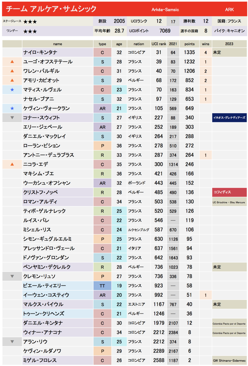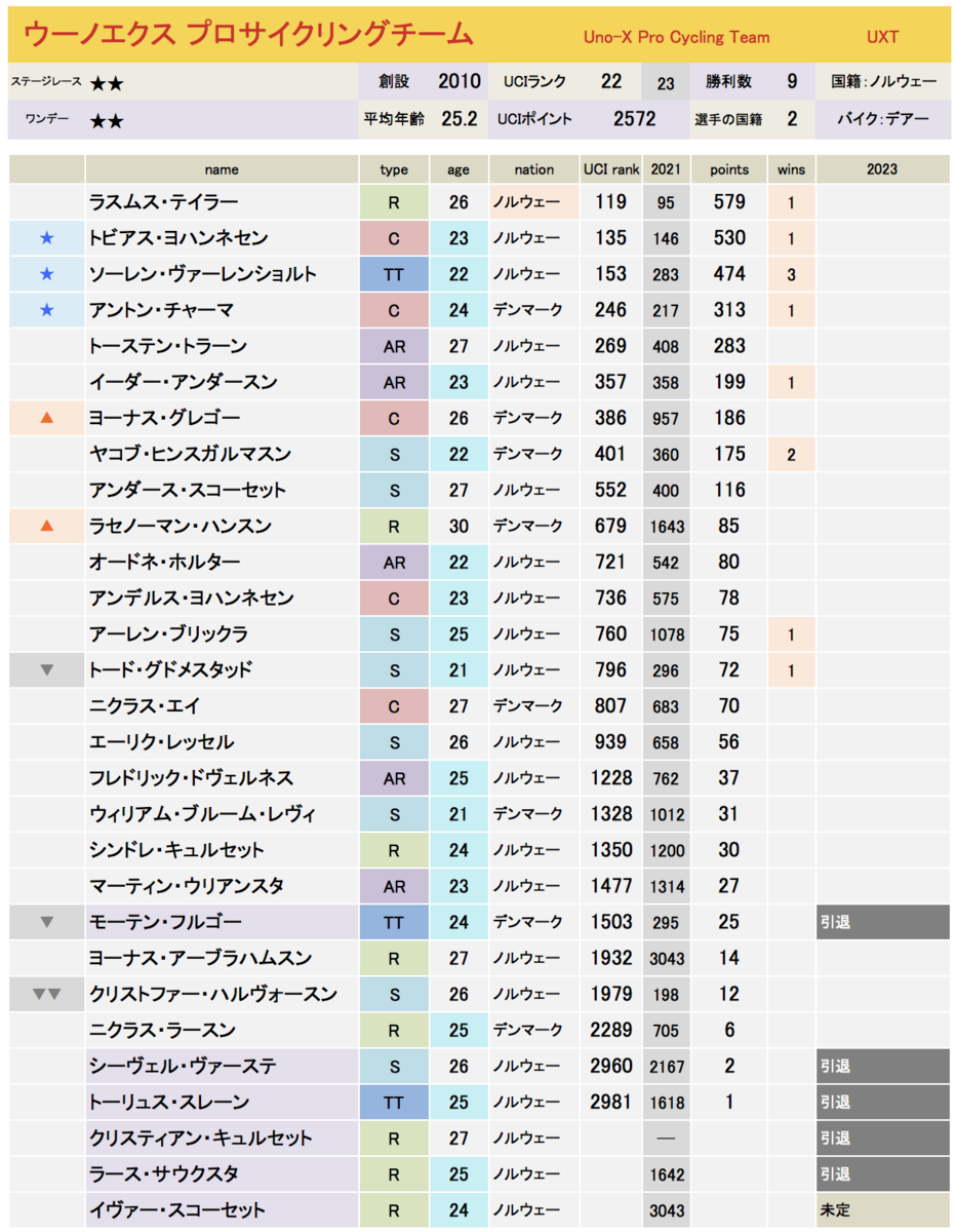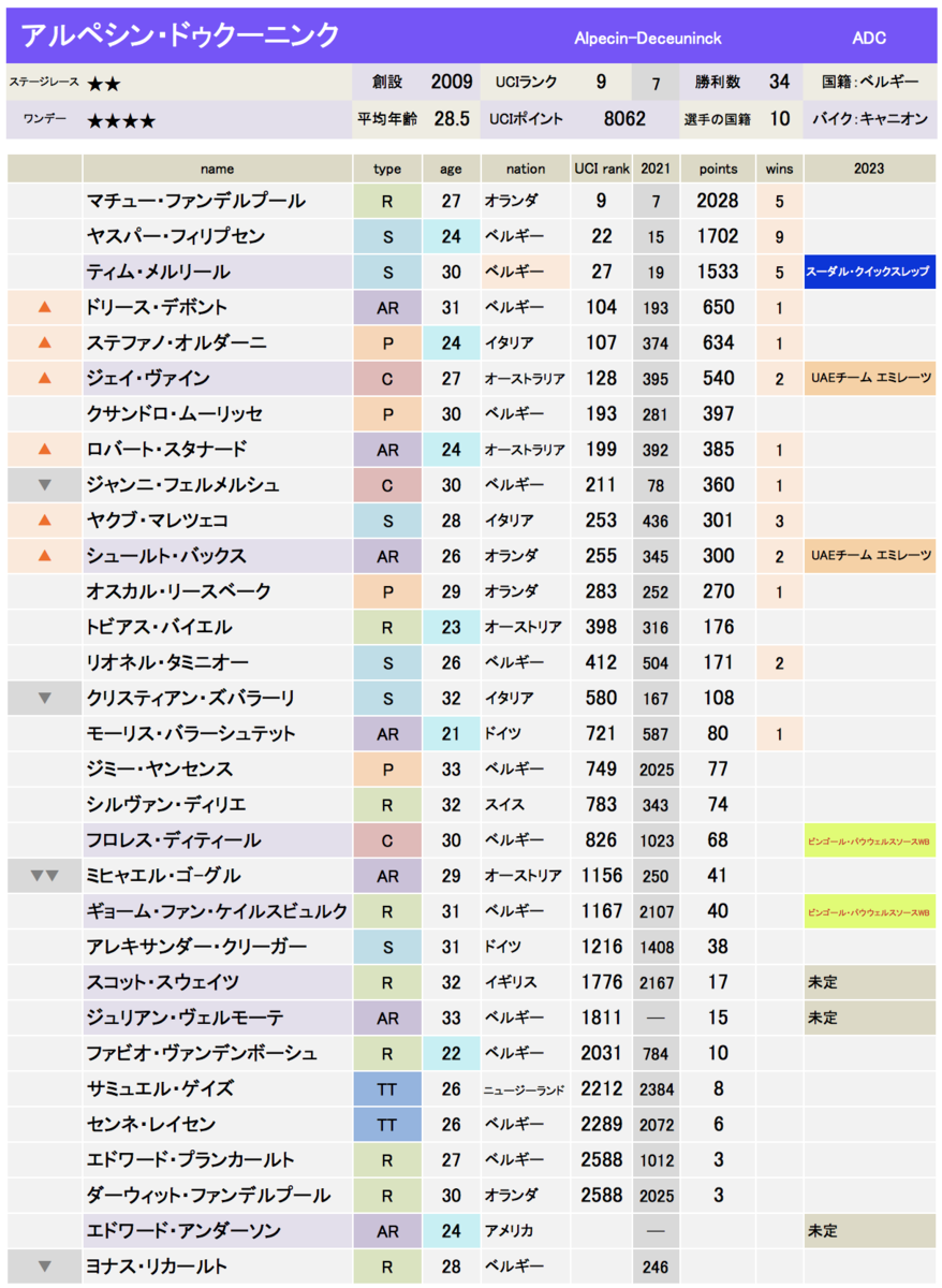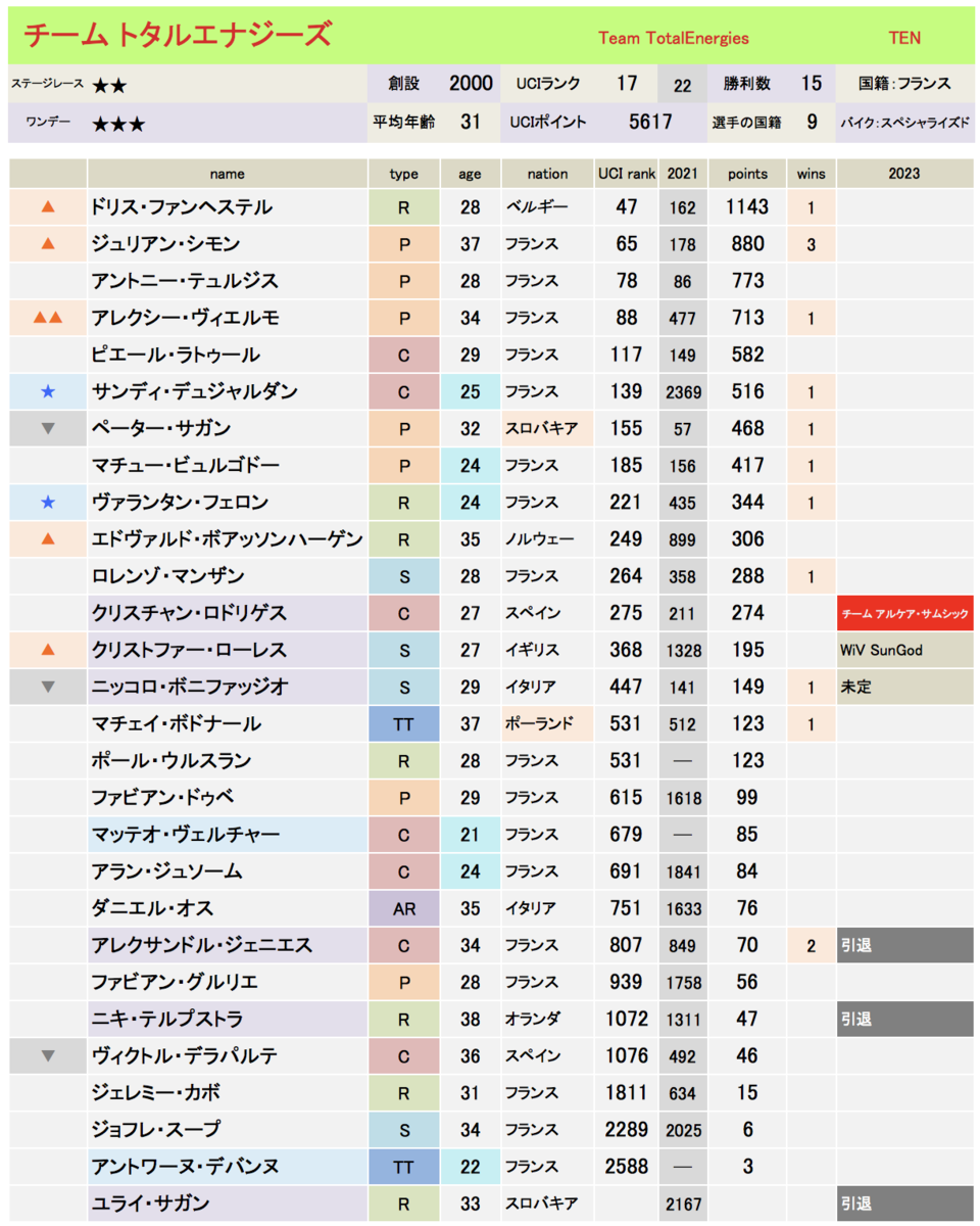 *選手は今年獲得したUCIポイントによるランク順で全選手を記載。名前がグレーになっている選手は来季チームを離れる。*脚質タイプは限定しにくい選手もいるので、あくまで目安です(脚質は、AR=オールラウンダー/C=クライマー/P=パンチャー/S=スプリンター/R=ルーラー/TT=TTスペシャリストで分類。主にチクリッシモを参考にしています)。*年齢は2022年12月1日現在で、背景色が水色なのはヤングライダー資格者。*国名に色がついているのはその国のナショナルチャンピオン。*UCIランクは2022年と2021年を記載。*勝利数は2022年分。*来季移籍先については2022年12月1日現在発表されているもの。契約が未定の選手も含んでいます。