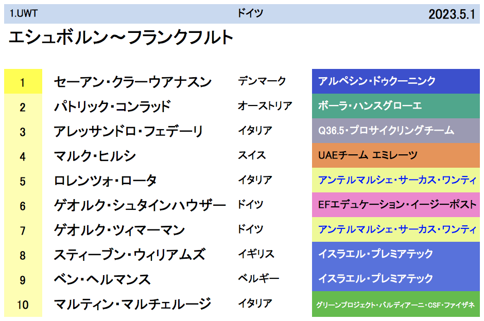 4位ヒルシ、5位ロータは実力者としてさすがの勝負勘の良さと強さ。スプリンターを振り切るアタックのきっかけを作ったのはヒルシで、グループの先頭で山頂をトップ通過したのはロータ。6位シュタインハウザーもサプライズの一人。ワールドツアーでははじめてトップ10入りしたプロ2年目の21歳は、母国レースだけにいつも以上に張り切ったこともあるだろうか、今年のEFは次々に面白い選手が台頭してきてレースを動かす流れに乗るのは好印象。チームの状態が非常にいい。7位ツィマーマンもロータと一緒にうまくアタックにのっかり、アンテルマルシェとしてもいいレースができた。8位ウィリアムズ、9位ヘルマンスはやや低迷しているチームに貴重なポイントを稼いだ。イスラエルはチームの状態が上がってきている印象。ヘルマンスはもともと実績はあるので、そろそろ不調から立ち直れるとチームとしても大きい。10位マルティン・マルチェルージもワールドツアーでははじめてトップ10入りしたプロ2年目の23歳。プロチームに貴重なポイントをあげることができたし、ポジティブな経験になった。