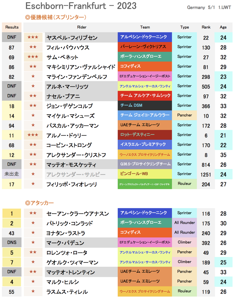 ちなみに、スプリンターではなかった場合に勝てると思って《アタッカー》として予想していた選手たちが上位に入っていて、それは悪くなかった。優勝したクラーウアナスン、コンラッド、ヒルシ、ロータ、ツィマーマンとトップ10のうち5名。《集団スプリントではなく、坂で仕掛けるアタッカーの優勝候補は下の表に記載した。スピードもあるクラーウアナスン、コンラッド、トレンティン、ティレル。登坂力で違いを作れるのはロータ、ヒルシ、パドゥンあたりか。チームでいうと、アンテルマルシェ、UAE、EFあたりは登坂での仕掛けの可能性が高いだろうか》なんて、レースの大事なところは抑えていたので。ただ判断を間違えたのは、最後はスプリンターが彼らに追いつけると思っていたのだが、追いつけなかったこと。想像以上に中盤の登坂でスプリンターや彼らのアシストが脚を使ってしまい疲弊し、追走に力を使える選手やチームが少なかったからだろう。ドゥリー、クリストフ、マシューズは登坂にも耐えて(スプリンターの中では)強さを見せたし、デゲンコルプやフィオレッリは登りでフラフラになりながらも最後まで頑張った。そういうライダーはやっぱり応援したくなる。それにしてもスプリンターにはどんどん試練が大きくなっていくようで、少々不憫である。