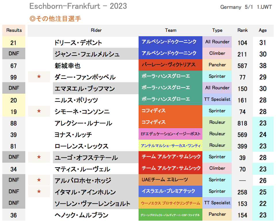 *表内の選手のUCI世界ランクと年齢は2022年12月末時点。
