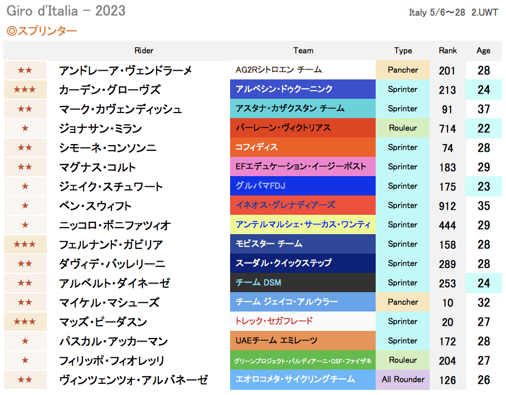 メンバー的にスプリントに力を入れてきている印象があるチームでは、ボニファツィオ(もしくはマーリッツ)と、フィオレッリ、アルバネーゼのイタリアのプロチーム。ゴール前の位置取り勝負に持ち込めるとチャンスはある。