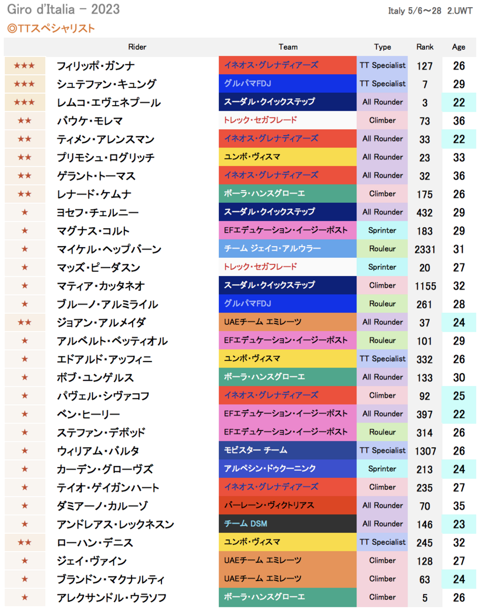 今年は個人TTが3ステージもあるため、TTに強い選手も集結している印象だ。個人TTの成績のいい選手は別の表にした(過去一年の成績順にほぼなっている)。残念ながら現世界選手権TT王者のフォスはCovid陽性のため直前に欠場になったが、各国ナショナルTT王者は元も含めると20人近くいる。登りがあるかどうかで顔触れは変わってくると思うが、この表のライダーたちは要注目。*総合優勝候補・スプリンターに入っている選手は重複している。