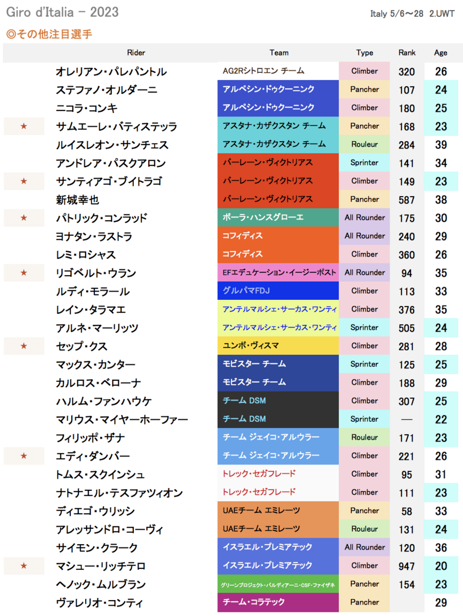 調子の良さそうなクライマー、パンチャーが多く揃っているのも特徴で、彼らは積極的に逃げに乗れば山岳賞争いも激しくなりそうな気配。バッティステッラ、ブイトラゴ、ロシャス、モラール、ヴァイン、ファンハウケ、テスファツィオンは有力候補のクライマーたち。この表には入れていないが(上記総合優勝候補に入れている)昨年も逃げてステージ優勝したケムナや、いま一番勢いのある若手ベン・ヒーリーは逃げて区間勝利をあげる姿がありありと目に浮かぶ。LLサンチェス、タラマエ、ダンバーはTTがいまひとつなので優勝候補にあげていないが、登坂力は総合上位を狙える力はある。コンラッドも好調。小集団でのスプリント勝負になる丘陵ステージでは優勝候補になる。