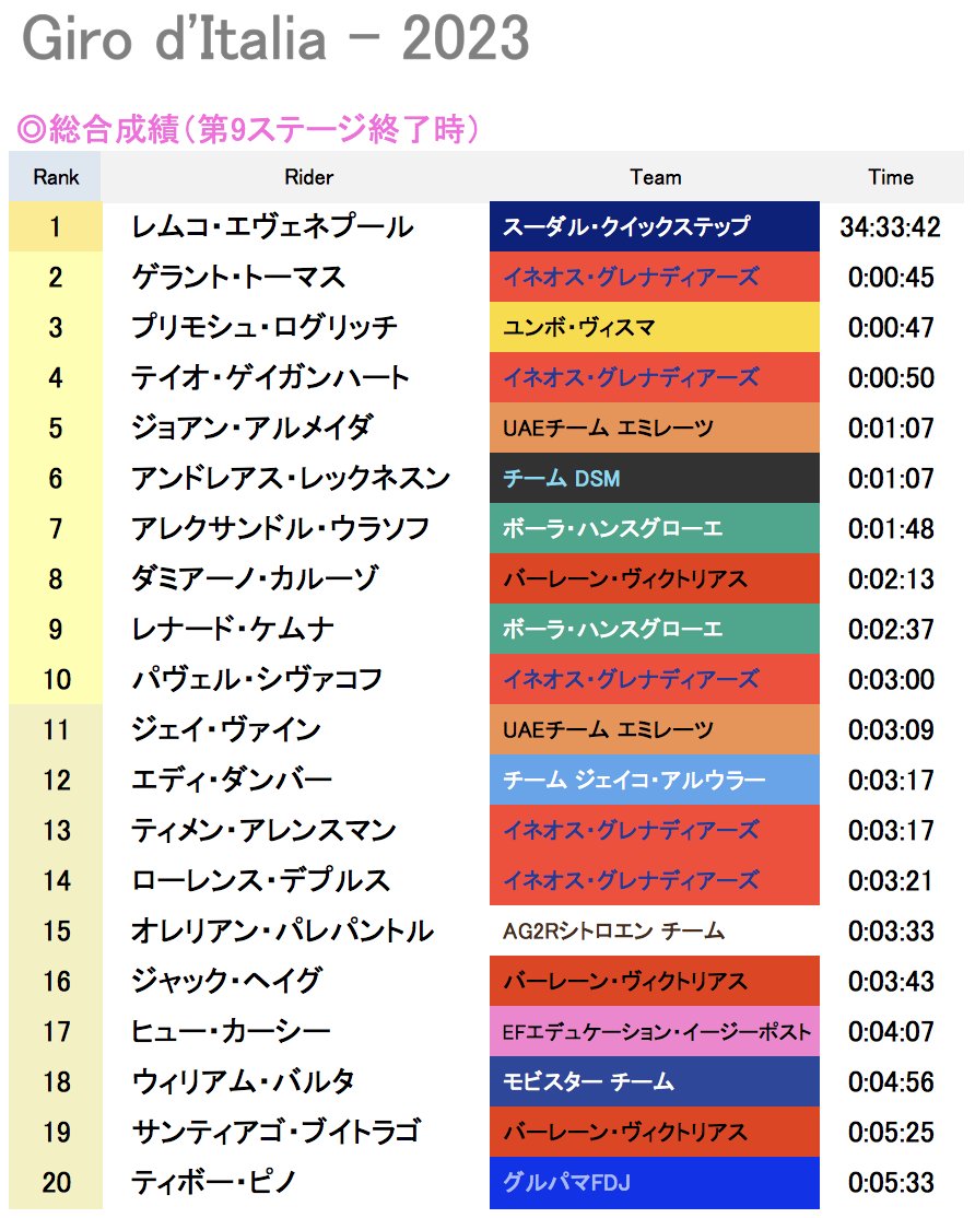 レムコ・エヴェネプールがCovid-19陽性によりレースから去ることになった(レムコについては下記《その他・雑感》に後述する)。休息日明けのstage10はひとつづつ順位が繰り上がり、G・トーマスがマリアローザになる予定だ。