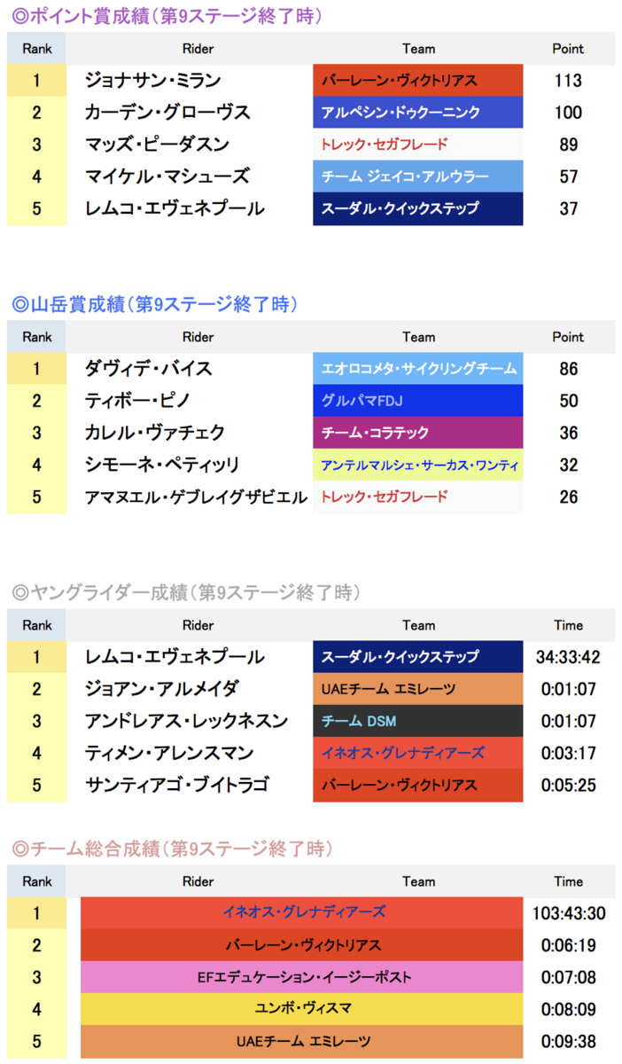 ポイント賞はステージ1勝を上げた4人が上位のかをを並べる。中でも安定してスプリント勝負で上位に入ったミランはかなり好調。ただグランツール初参戦の彼にとっては2週目以降は未体験ゾーン。ここから厳しさを増す山岳でどれだけ走りきれるか。総合上位に複数の選手を抱えるバーレーンでは彼もそれなりにアシストとして貢献もしないといけないこともライバルたちよりも大変である。その点では、グローブス、ピーダスンは彼らが中心のチームであることは有利であり、厳しい山岳が増えてくる2週目以降は登坂力のあるピーダスン、マシューズがポイントを重ねていきそう。