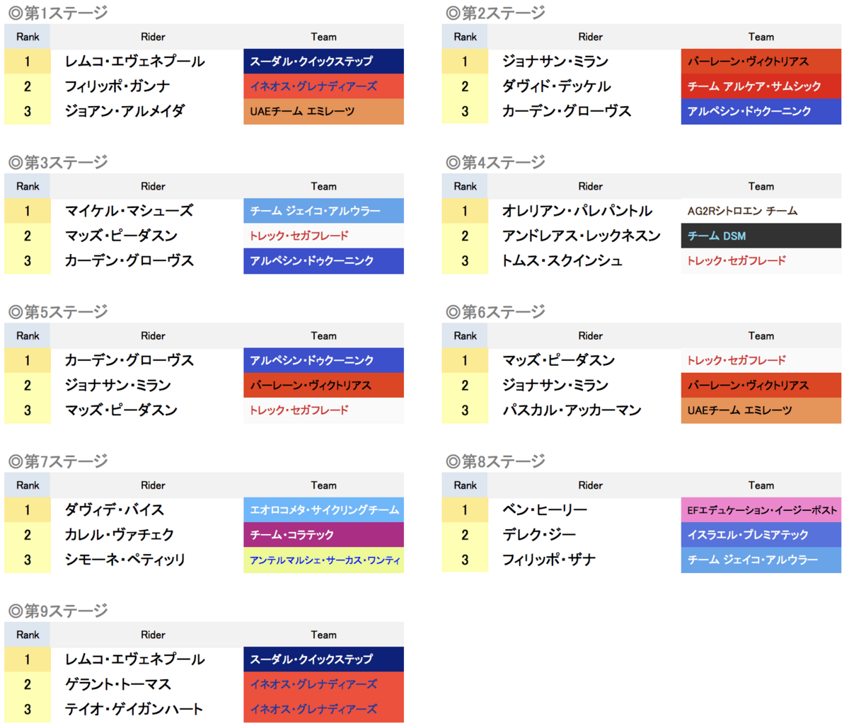 ここまでは3つのステージで逃げ切りでの勝利。さらにゴール直前に差し切られたステージもあり、プロチーム中心に“勝つため”の積極的な逃げがレースを面白くしている。TTが二つあったので、およそ半分のステージは逃げがステージ優勝に直結。この後は総合タイム差が開いて容認される有力な逃げグループが形成されやすくなるので、この傾向は続きそうな気配がする。ヒーリーにはあと二つくらいチャンスがありそう。