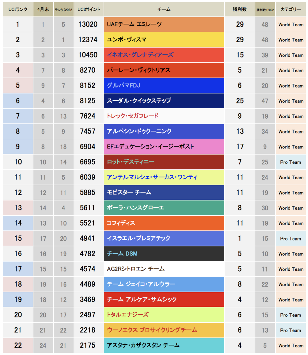 クラシックレースの好調なチームが大きくジャンプアップしつつ、今季のチームの状態もより一層見えてきた。*表はUCIランク順で、ワールドチーム18チームと昨季上位の4つのプロチームで構成。UCIランクと勝利数は2022年分もグレーで表記。UCIランクは前月から上がったチームはピンク、下がったのはブルーにしている。