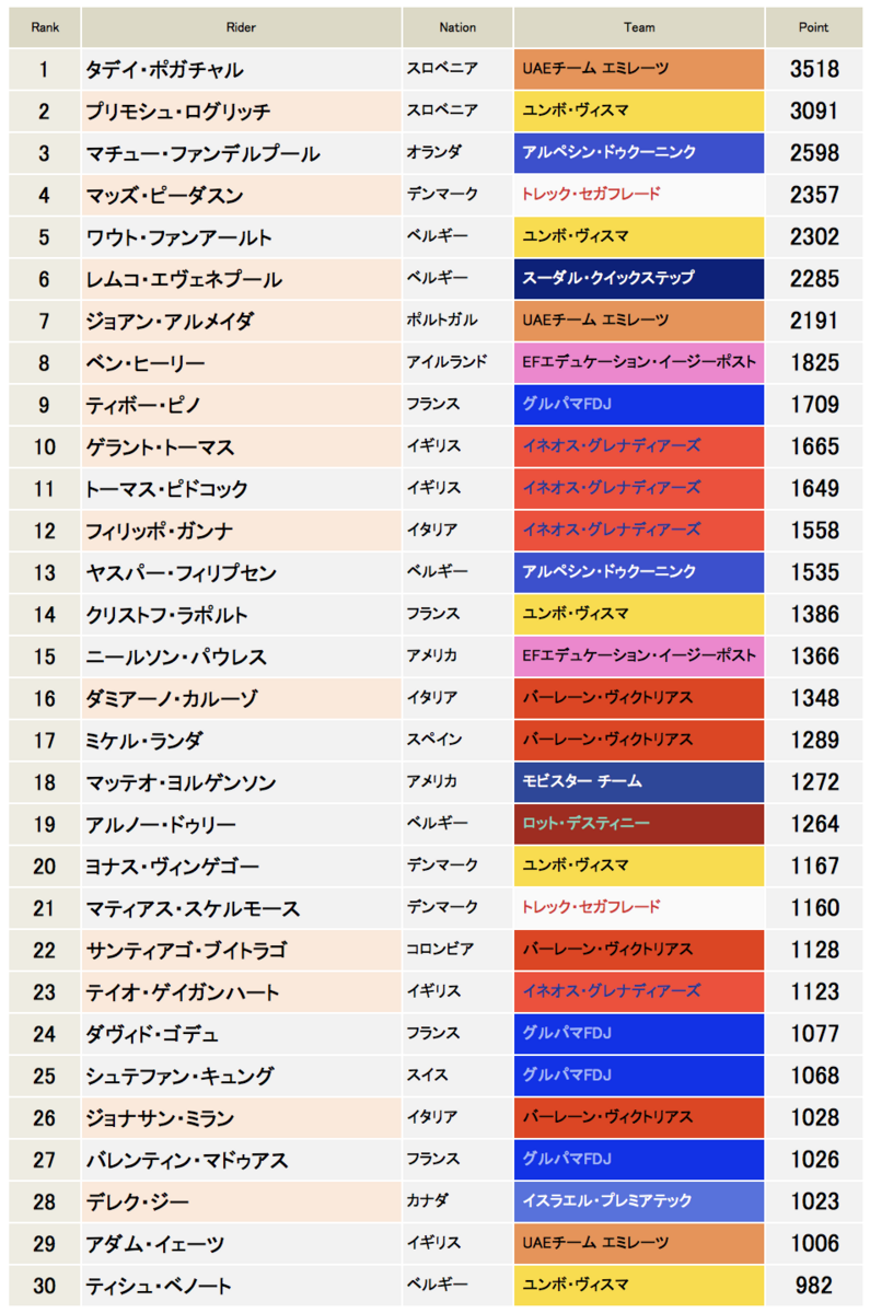 一方、スーダル、トレック、アルペシン、EFは少し順位を下げた。それぞれレムコ、ピーダスン、グローブス、カーシーとジロでエースを担った選手たちがリタイアしたことがpt面では残念な結果になったのは致し方ない。