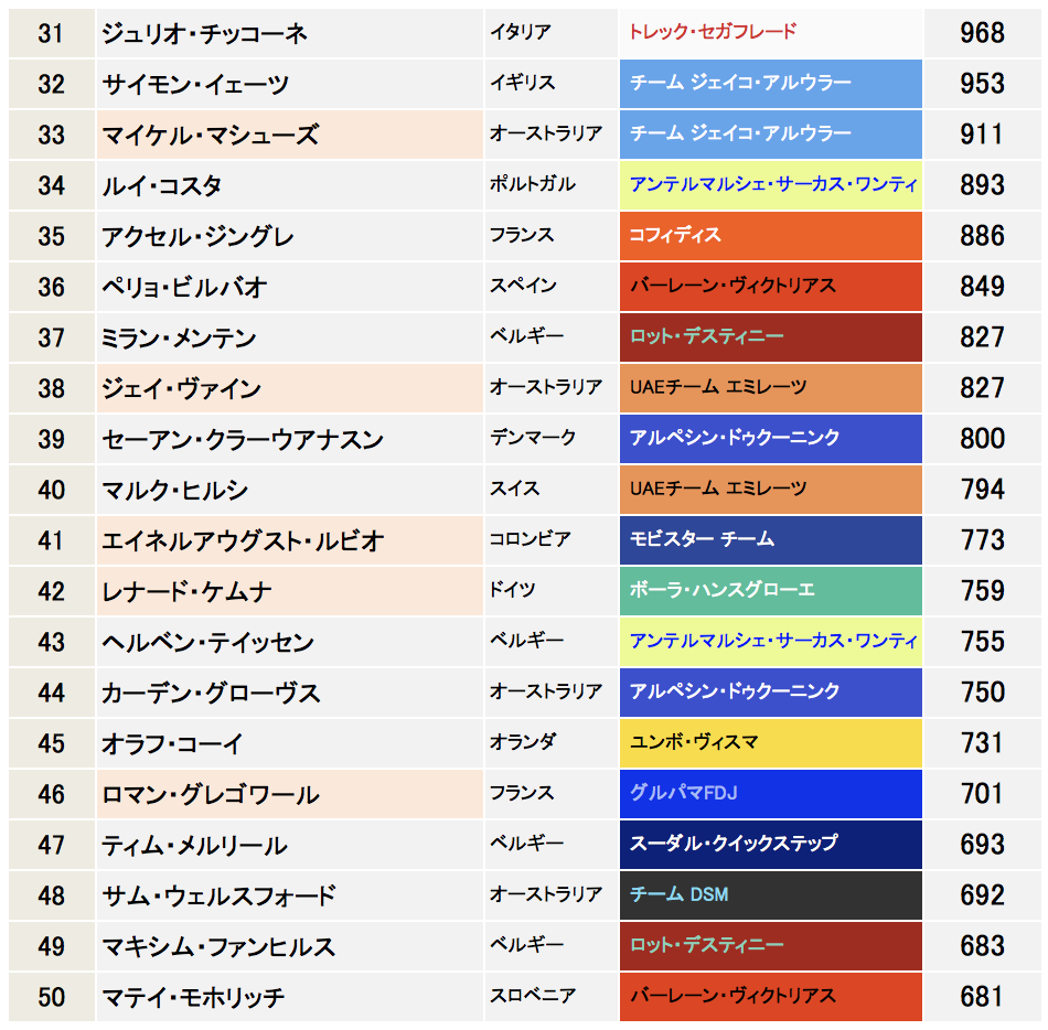 ランキング上位50名を表にした。ジロで活躍した選手たちが先月からランキングを大幅にあげた。以下コメントは特に気になる活躍をしている選手にのみ言及する。また活躍したレースが1〜4月中心の選手は下記リンクから辿ってください。