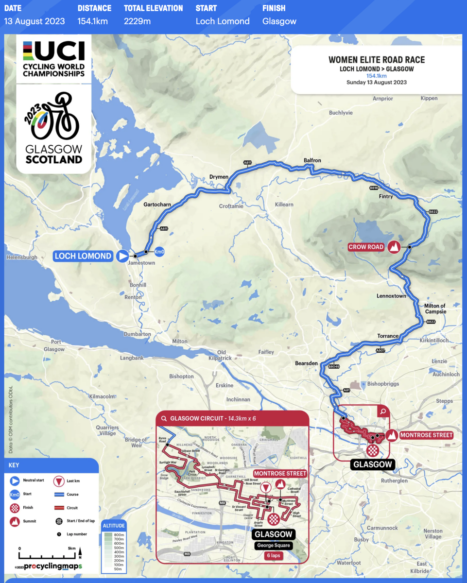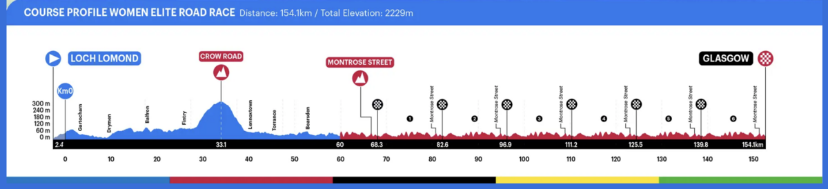 コースの総距離は154.1km・獲得標高は2229mでコースの8割方は男子と重なり、難易度は高くないが勝つにはなかなかハードなコース。ローモンド湖をスタートし東に向かい(地図上の青い線)、コース上唯一の山(丘)クロウ・ロードを超えて、グラスゴー市街地の周回コース(赤の線・1周14.3km)を6周する。コーナーが多く(1周の間に40箇所以上もある)、終始アップダウンを繰り返し、特にゴール直前のモントローズ通りは200mほどの距離しかないが11%を超える斜度があり、選手が徐々に篩にかけられていくサヴァイヴなレースになるだろう。生き残ることができた小集団の選手たちによるスプリントか、残り2周あたりからアタックを決める選手が勝つような展開が予想される。登りをこなせるスプリント力のあるパンチャー系の選手、テクニカルでタフなレースに強いワンデーレーサーが有利。その辺りは男子同様になるだろう。