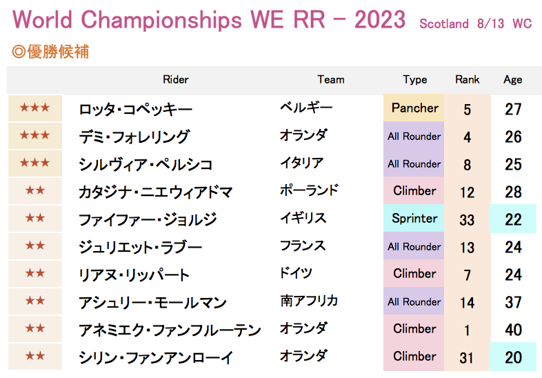 8月13日にスコットランドで開催される第90回目の【世界選手権(ロードレース・女子エリート)】。今年の世界選手権をしめくくるレースになる。以下、国別に有力選手を簡単にまとめた。