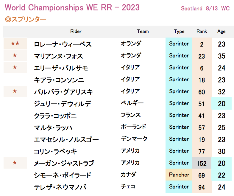 ゴールは有力スプリンターを含む集団スプリントになる可能性も排除できない(可能性は高くないと思うが)。とはいえ、ピュアスプリンターというよりもクラシックレーサーと呼べるようなタフな選手に限定され、終盤まで先頭集団に残っているようならアルカンシェルのチャンスはある。現在最強スプリンターのロレーナ・ウィーベスは登坂力は向上していて、最終盤まで残る可能性はじゅうぶんあり、他にはマリアンヌ・フォス、2021年世界王者のエリーザ・バルサモにもチャンスはありそうだが、この二人は今季は怪我等の影響もあり調子を落としている印象で、優勝に絡むのは苦しそう。他にも実績のあるスプリンターは多数出場する(表参照)。彼女らが逃げに乗って終盤までいけたらチャンスあり。