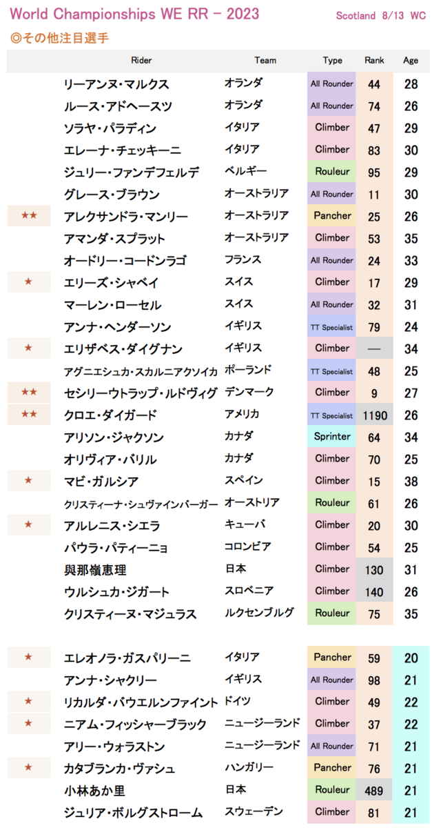 星をつけている選手は好成績を期待したい。中でもパンチ力のあるアレクサンドラ・マンリー、登坂力のある人気者のセシリーウトラップ・ルドヴィグ、先日の個人TTでアルカンシェルを獲得したクロエ・ダイガードはトップ10候補にするか最後まで迷った。ダイガードは少し体調を崩していたこともあり、サバイバルな展開になりそうなレースではちょっと厳しいだろうか。(星を付け過ぎると節操がないので自重したが)独走力のあるグレース・ブラウン、オードリー・コードンラゴ、アグニエシュカ・スカルニアクソイカあたりは逃げに乗ると危険な実力者。U23では勢いのあるリカルダ・バウエルンファイント、シクロクロスでも強いカタブランカ・ヴァシュも好成績を期待。日本からは與那嶺恵理とU23では小林あか里が出場。その他の選手は下記表を参照。