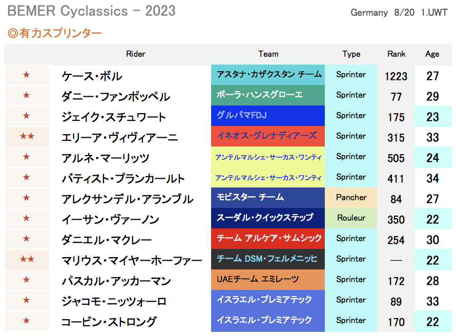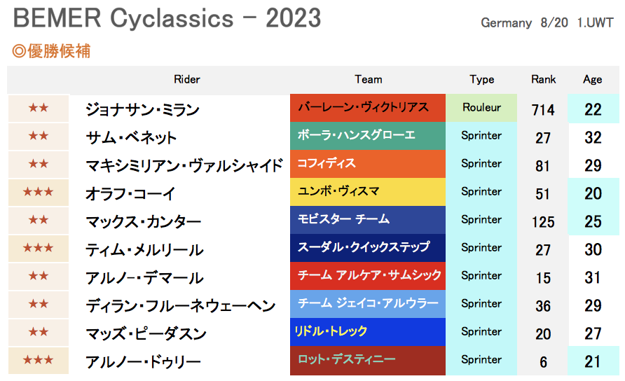8月20日にドイツで開催される第26回目の【ベーメル・サイクラシックス】。ワールドツアーの中では比較的新しいレースであり、スプリンター向けのワールドツアーでは今年最後のワンデーレースになる。ということで、各チームともスピード自慢をきっちり集めてきた。トップクラスのエース対決といっていいメンバーで、見応えのあるスプリント勝負を期待したい。