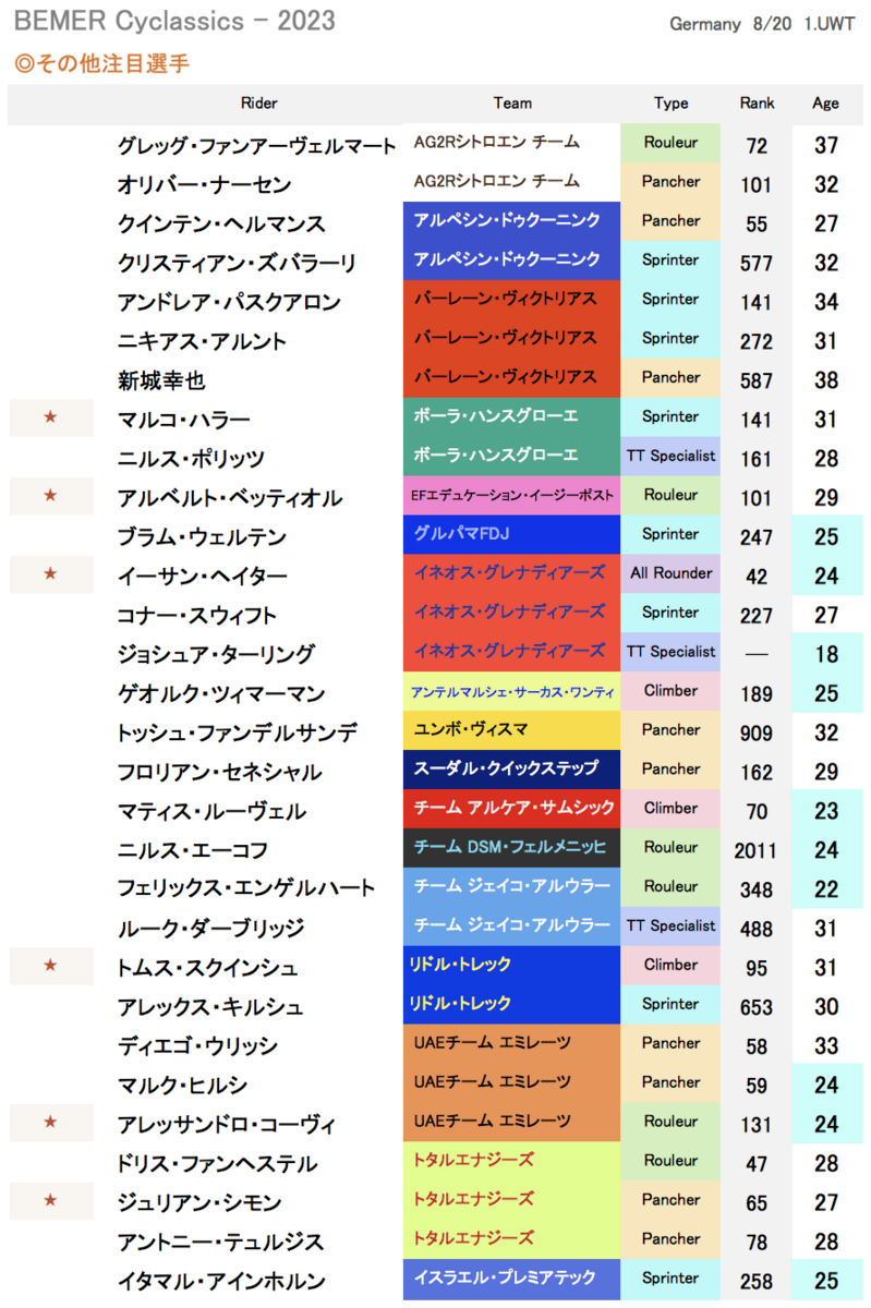 上記優勝候補から漏れた有力スプリンター(リードアウト含む)とその他の実力者たちを分けて表にした。スプリンターではヴィヴィアーニとアッカーマンはトップクラスの実績があるが、ともに現チームでは成績を残せていない。ヴィヴィアーニはイネオスに移籍後小さいレースで昨年2勝したのみ(トラックでは無双に近い成績を残している)で、過去3連覇した相性のいいレースとはいえ、勝てるイメージがわかず、イネオスは怪我明けのヘイターで勝負するようにも思える。アッカーマンは先日のツールでステージ優勝をあげるなどうまくはまれば表彰台も狙えそう。ただしUAEはチームとしては強い選手は多いがスプリントのトレインという意味では他より劣る。同様にニッツォーロもイスラエルに移籍後ここ2年ではわずか2勝と苦しい状態が続いている。ジェイク・スチュワート、マリウス・マイヤーホファー、アルネ・マーリッツはまだまだ伸びる若手スプリンター。先輩たちの胸を借りるつもりで頑張ってほしい。