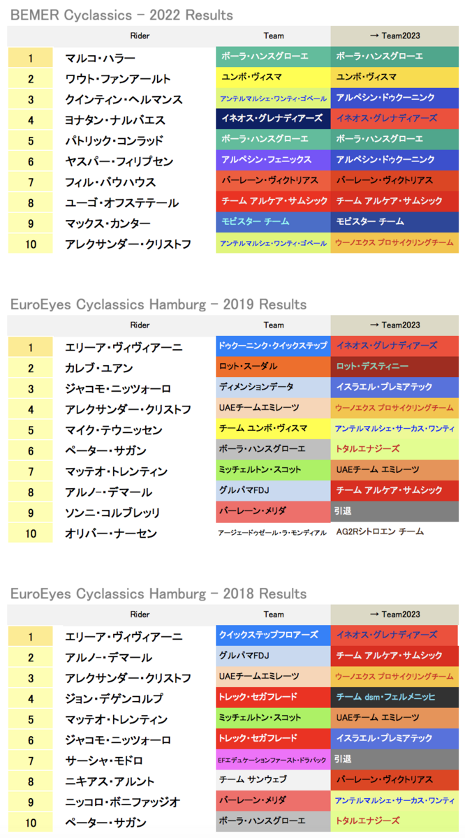 参考までに過去3年分の上位10位を入れておく。所属チームは今季との比較も。なお2021、2020年は中止された。スポンサーの変更に伴い以前とレース名は変わっている。またほとんどは集団スプリントで決着している。