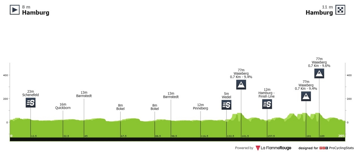 ハンブルグの市街地をスタートし郊外の平坦路をぐるりと回って、ゴールはスタート地にほど近いハンブルグ市街地周辺をもう1周するコース。総走行距離は205.6kmで、7つの山(丘)を越えても獲得標高は1004mしかなく、中盤まではほぼ真っ平ら。中盤から終盤にかけて変則的に3回登る70mほどのヴァーゼベルグが勝負どころ。道も狭く勾配は最大12%を超える1km程の急坂を乗り越えれば、最終的にはスプリンターが追いつき、スプリントで決着することが多いが、昨年は劇的な逃げ切り勝利が決まっている。
