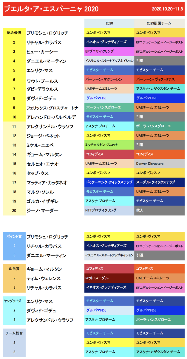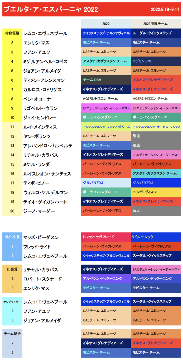 興味深い近年のジンクスとしては、ブエルタで印象に残るグランツールデビューをした若手選手は翌年大きく飛躍している。2019年総合3位のポガチャル(翌年ツール総合優勝)、2020年ログリッチをアシストしたヴィンゲゴー(翌年ツール総合2位)、2021年総合13位のフアン・ペドロ・ロペス(翌年ジロでマリアローザ着用)など。今年も多くの有望な若手がグランツールデビューをする。ヤングライダーにも注目である。