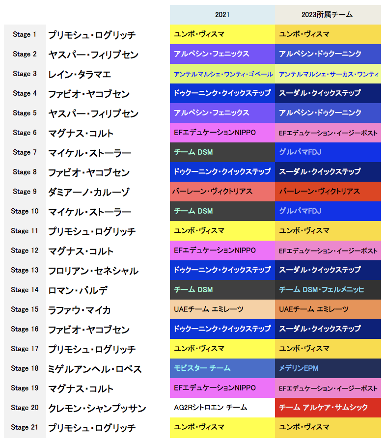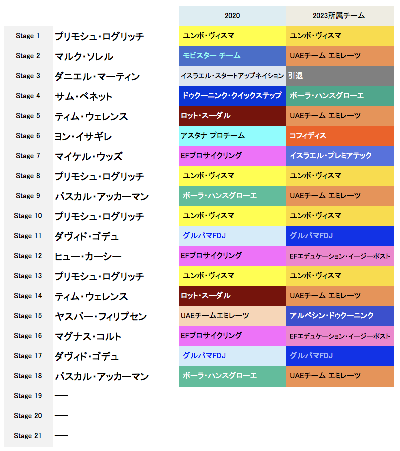 参考までに過去3年間の総合成績20位までと各賞(ヤングライダー・ポイント賞・山岳賞)、各ステージ優勝者を一覧表にした。所属チームは今季との比較も。