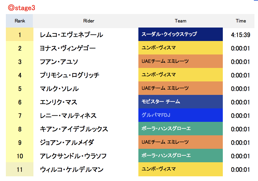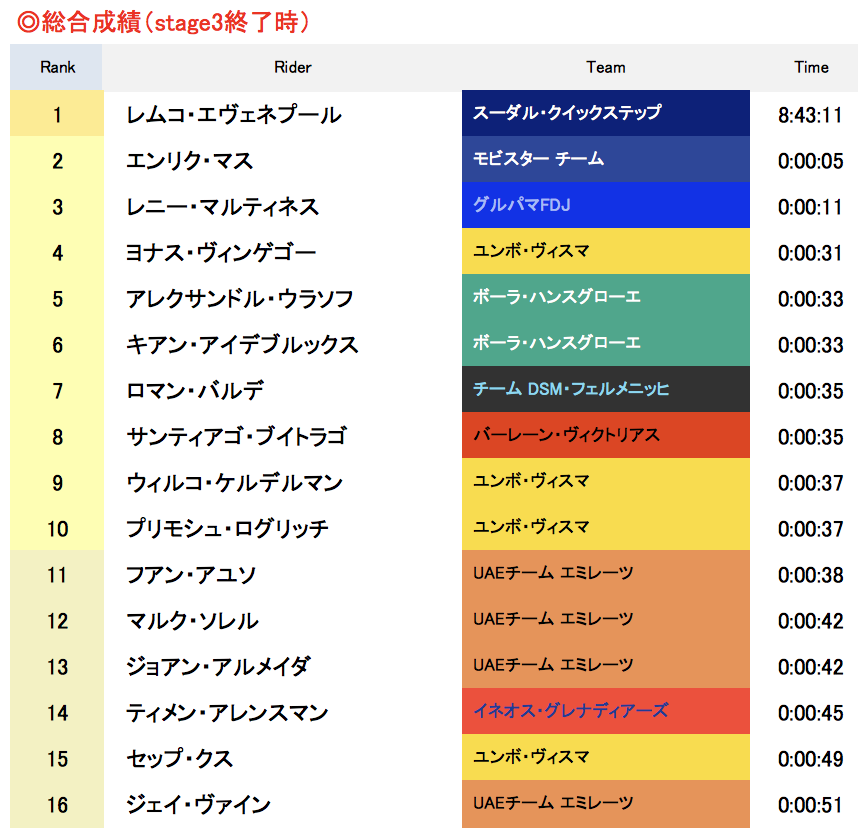 stage3の先頭集団でゴールした11名と総合成績は以下の通り(総合成績はチームTTのタイム差が主な要因)。