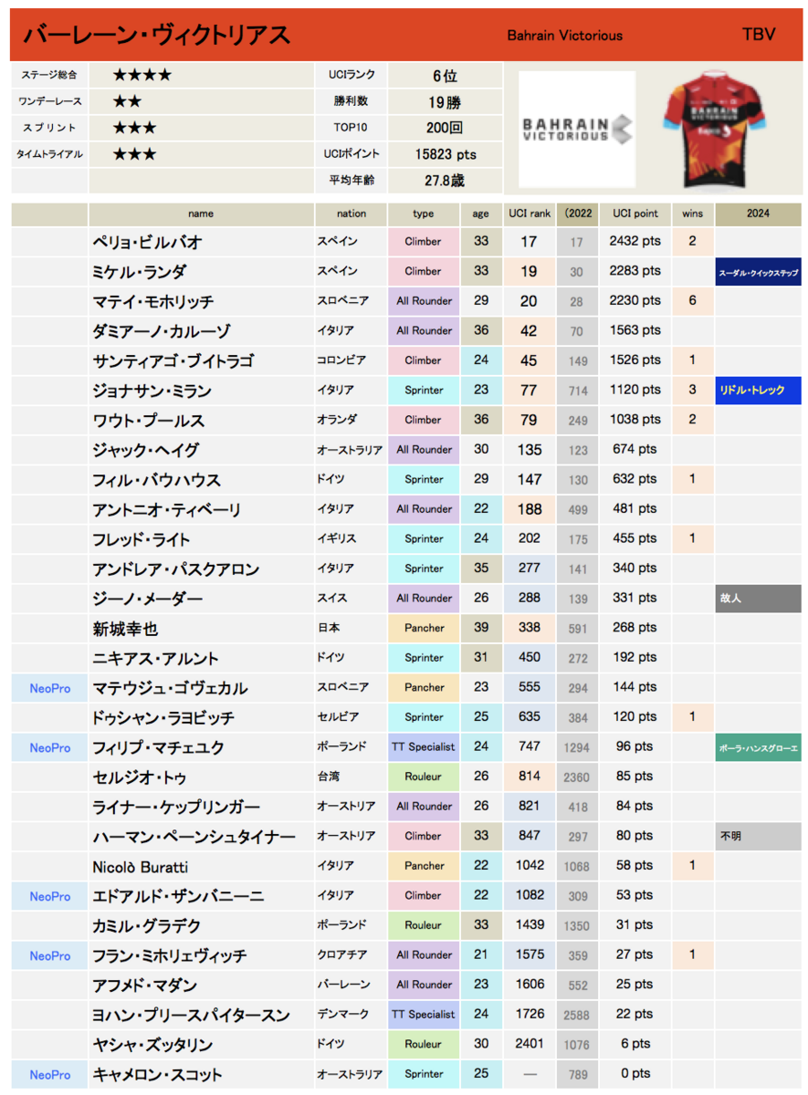 *選手は2023年のUCIランク順で記載。*左端はネオプロorトレイニーの分類。*脚質タイプはあくまで目安(主にチクリッシモを参考にしつつ成績等の傾向から振分け)。*年齢は2023年12月31日時点/背景色は、25歳以下=水色・31歳以上=ベージュ。*UCIランクは2023年と2022年/成績大幅アップ=ピンク・ダウン=ブルー。*勝利数は2023年分。*来季移籍先は2023年12月13日現在の発表済のみ。契約未定の選手は不明と表記。*チームの強さはレースタイプ毎に★印で五段階評価(チームのリザルトを基準にしていますが、主観混じりなのはご了承ください)。
