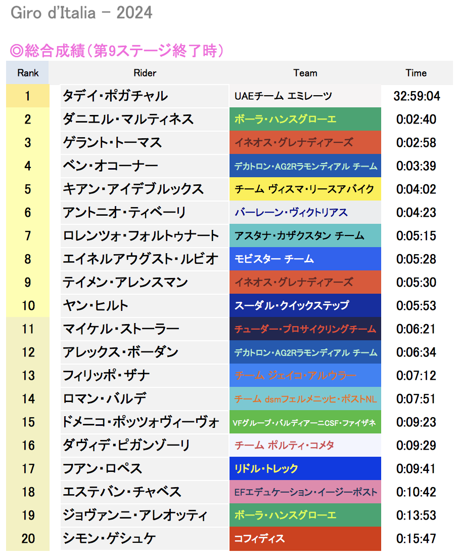 stage9(丘陵)は、終盤にある4級山岳といくつかの丘による絶妙なコース。メイン集団は序盤から逃げたポルティ・コメタの二人をキャッチし、終盤の起伏でアルペシンの高速牽引で数人のスプリンターたちが脱落。アタックしたアラフィリップに数人がジョインして逃げ切り勝利を目指す。それを逃さないメイン集団からナルバエスが残り8kmで隙をつき単独でアタック。アルペシンとリドルが追いかける中、マリアローザのポガチャルもモラノの勝利のために高速牽引。最終的に残り10mで集団は追い抜き、数人のエーススプリンターがほぼ横並びでハンドル投げ。ジロデビューのコーイが念願のグランツール初勝利を遂げた。リードアウトでありチームリーダー役のラポルトがリタイアし、自らも落車による怪我を負いながら掴んだ見事な勝利だった。