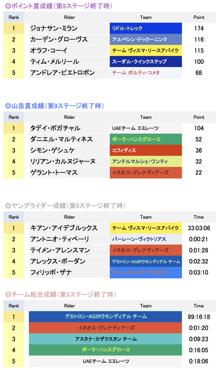 チーム総合は、デカトロンが今年の好調ぶりを見せつけて、最終的にこのまま1位になっても不思議はないほどチーム全体の良さが目立つ。2位につけているイネオスはTTでの強さも優位なところ。アスタナの3位は大健闘であるが、エースのルツェンコがリタイアし、この順位をキープするのはちょっと難しそう。ボーラとUAEは総合争いをするエースを中心にタイム差を稼いで順位を上げると思うが、1位になれるかというとちょっと無理そうな気がする。エース以外の選手がアシストに徹して力が落ちる印象であり、チーム総合はそれほど狙ってないと思われる。他に順位を上げる可能性があるのはバーレーン、ジェイコあたりか。