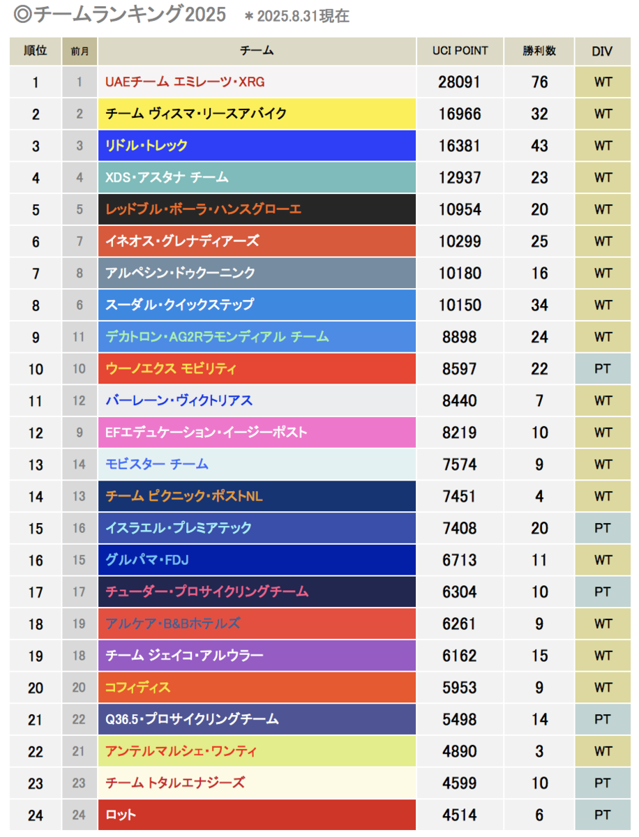 シーズンも終盤に入り、チームの序列がはっきりとしてきた。UCIランクと勝利数を確認しておく。*表はUCIランク順で、ワールドチーム18チームと昨季上位の6つのプロチーム(ワールドツアー常連チームという扱い)で構成。チーム名のカラーはジャージのカラーをイメージしています。順位は比較として前月(7月末)も記載。2025年の獲得したUCIポイントと勝利数を記載。WT=ワールドチーム/PT=プロチーム。