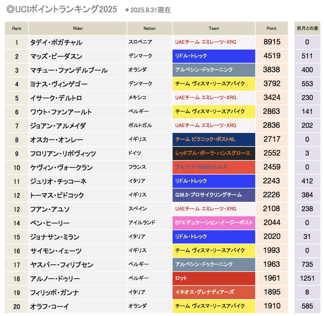 *表のUCIポイントおよび勝利数は2025年第33週(8月31日)までの集計。