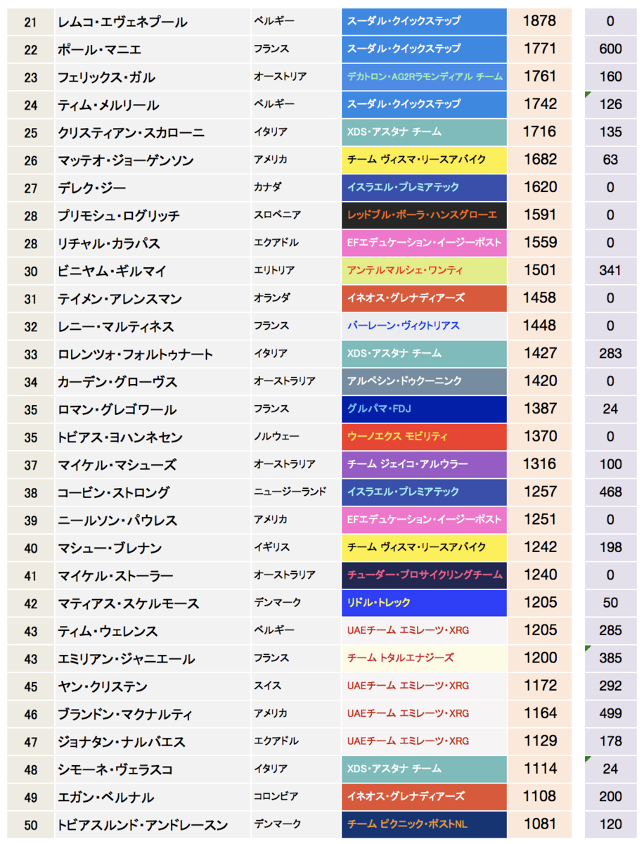 表の一番右に前月とのポイント差を記載したのでこの一ヶ月での活躍ぶりはわかりやすいと思う。8月に大きくポイントを稼いだのは、ワールドツアーのステージレースではポローニュとレネウィツアーとブエルタ前半戦、ワンデーはサンセバスティアンやブルターニュクラシックで、プロクラスではブルゴスやノルウェー、デンマークのステージレース等で好成績を収めた選手たちが中心。上位50人の顔ぶれは前月とあまり変化はないが順位は大きく変わっている。特筆すべきなのは18位に入ったドゥリーで、このひと月だけで1251ptと破格のポイントを稼いでいる。シーズン終盤になってよやくコンディションが戻ってきたようだが、とんでもないポテンシャルであることを改めて示した。他にはフィリプセン、コーイ、マニエ、ストロングらのクラシックにも強いスプリンターが大きくポイントを稼いでジャンプアップ。相変わらずUAE(8人)とヴィスマ(6人)の選手が多くランクイン。リドルが4人で続き、当たり前だが上位のチームほど多くの選手がいる。